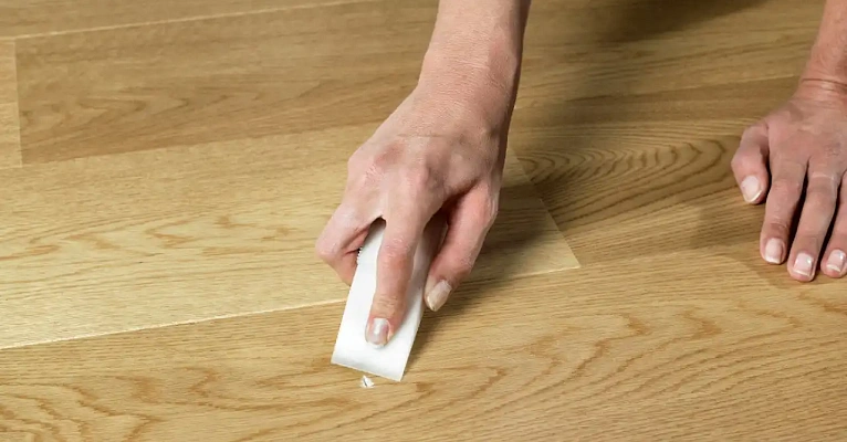 После полного застывания клея удалите скотч, которым защищали область линолеума вокруг.
