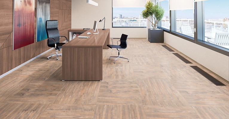 Португальский производитель Floorway представляет универсальное коммерческое ламинированное покрытие. Данный ламинат выполнен в виде отдельных планок небольшой длины, благодаря чему полностью имитирует штучный паркет. А необычный оттенок и натуральный древесный рисунок дополняют оформление и визуально приближают материал к натуральному дереву.