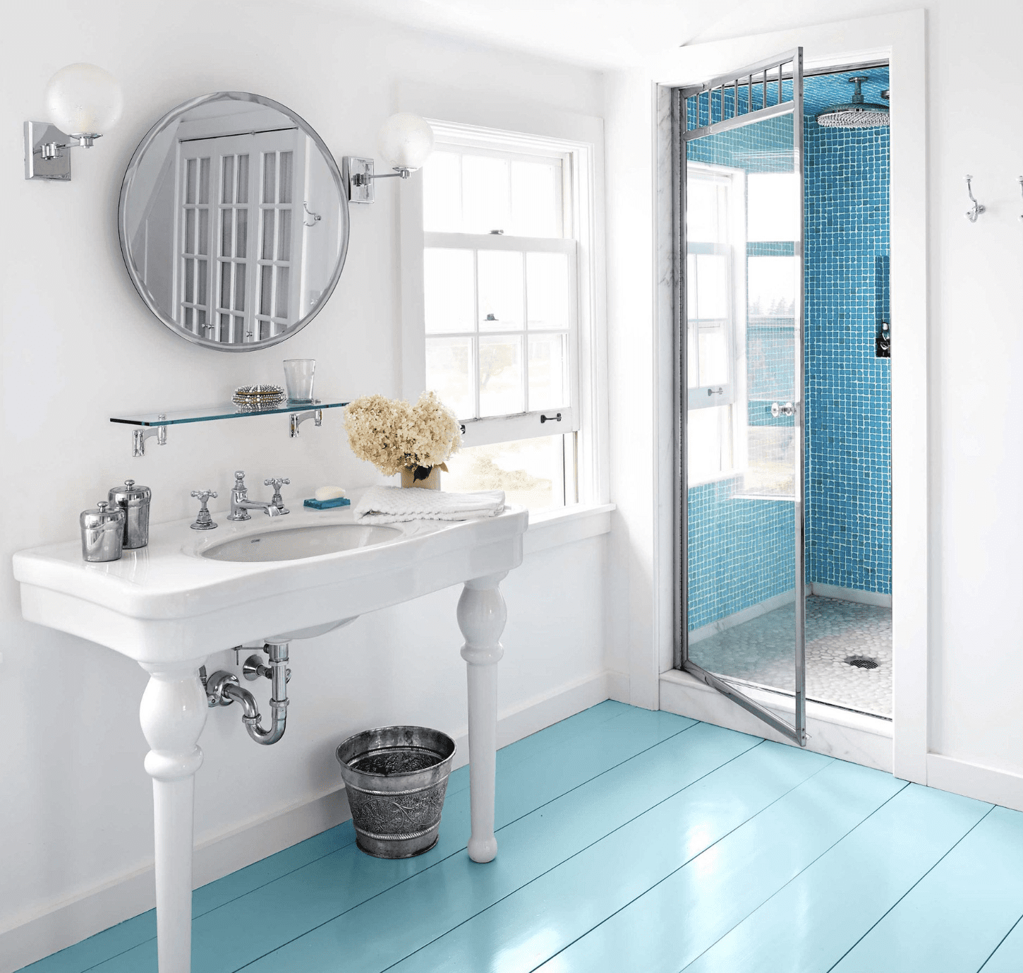 Голубой цвет считается достаточно универсальным, поэтому может использоваться практически в любом стиле. Однако лучше всего его оттенки сочетаются со стилями, обращающимися к прошлым векам. Лучше всего голубой пол впишется в интерьеры стиля прованс или шебби шик. Нежные пастельные оттенки этого цвета прекрасно дополняют обилие декора, извилистые элементы интерьера и общую концепцию.