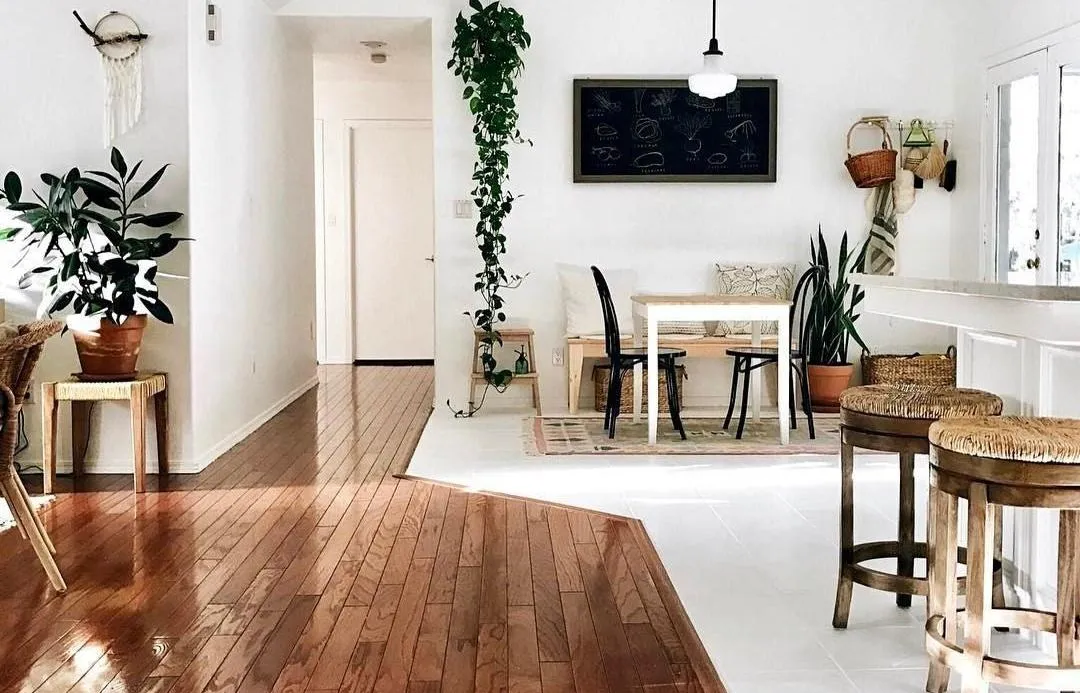 Сочетание нескольких напольных материалов несет в себе и эстетическую и практическую пользу. Например, комбинация плитки и ламината между кухонной зоной и коридором позволяет разделить комнаты без использования дверей или перегородок. Также материалы удобно сочетать, подбирая их в зависимости от назначений комнаты. Среди преимуществ такого дизайна: