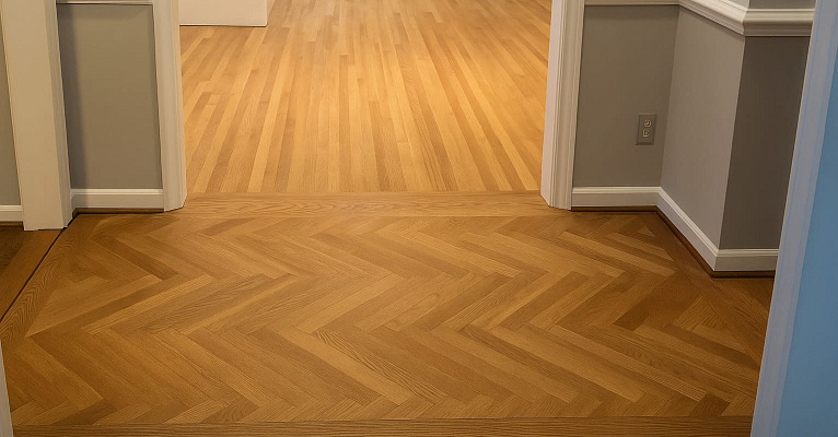 Если вы хотите, чтобы пол выглядел единым и без лишних деталей, можно сделать соединение без порога. Это современный, эстетичный вариант, но он требует высокой точности при укладке.