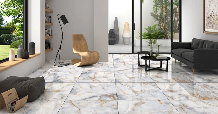 Материал подходит как для внутренних помещений, так и для экстерьера. Внутри керамогранит используют в жилых зонах — в ванных, на кухнях, в коридорах и гостиных. Для влажных зон и кухонных фартуков оптимальны плитки небольшого размера (до 60×60 см), для коридоров и прихожих — антискользящие варианты нейтральных оттенков, а в гостиных и просторных комнатах особенно эффектно смотрятся акцентные плитки с полированной, лаппатированной или карвинговой поверхностью, которые подчеркивают текстуру и красиво играют при разном освещении.