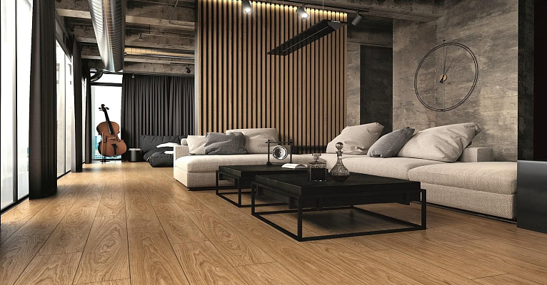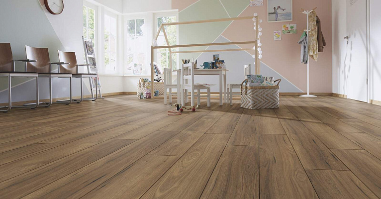 Модель отличают качественный рисунок и классический цвет. Вместе с другими прочностными характеристиками это дает возможность использовать ламинат в коммерческих целях, например, для торговых площадей и гостиниц.