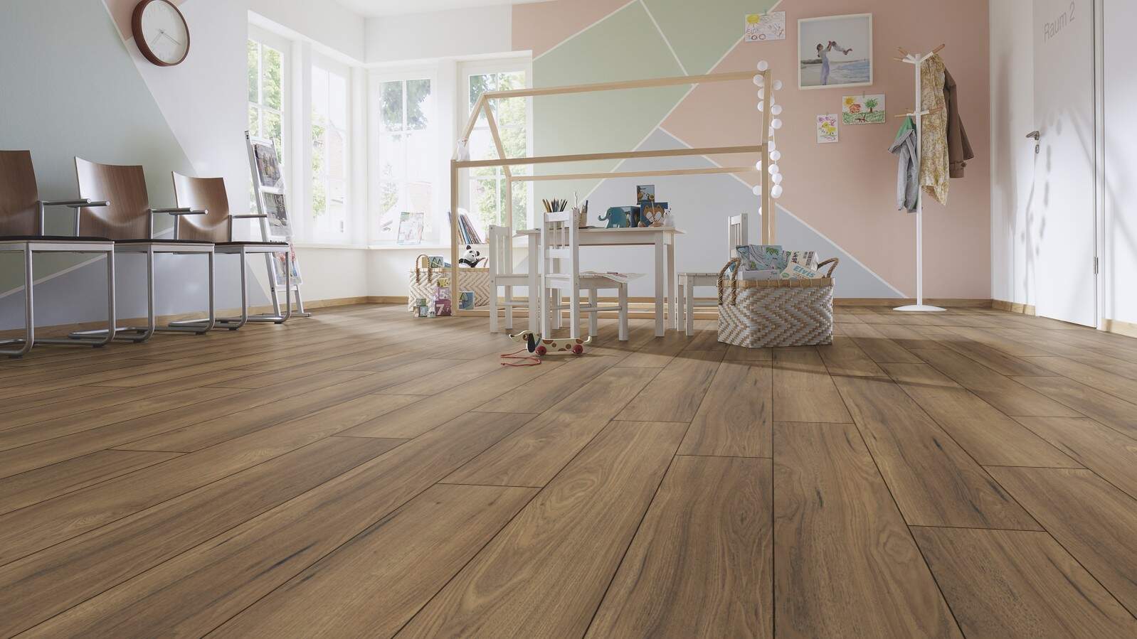 Широкое разнообразие дизайнов вместе с экологичным высокопрочным составом позволяют использовать покрытия KRONOTEX в абсолютно любых целях: от отделки ламинатом детских комнат до оформления элитных офисов.