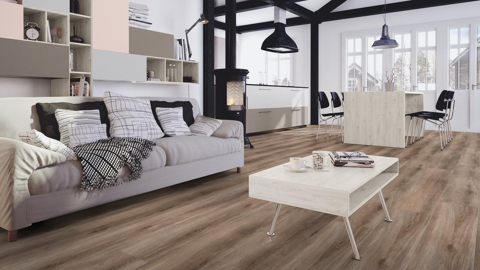 Модель отличают качественный рисунок и классический цвет. Вместе с другими прочностными характеристиками это дает возможность использовать ламинат в коммерческих целях, например, для торговых площадей и гостиниц.