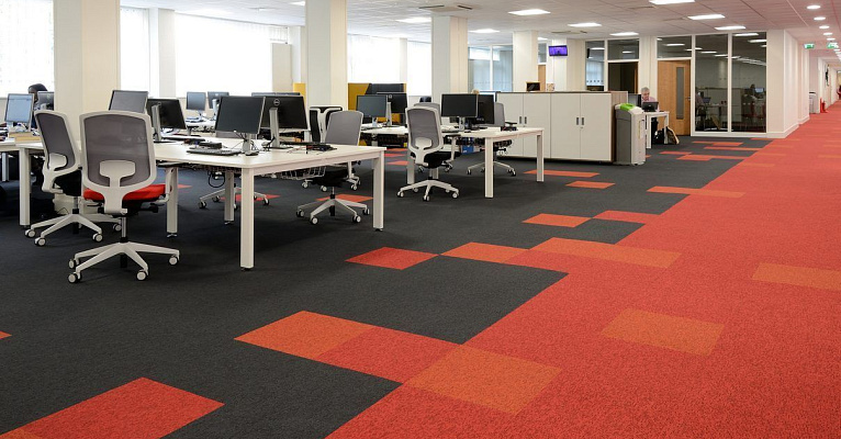 В офисе выгодно проявляются такие качества, как износостойкость ковролина, хорошая теплоизоляция и свойства пожаробезопасности.