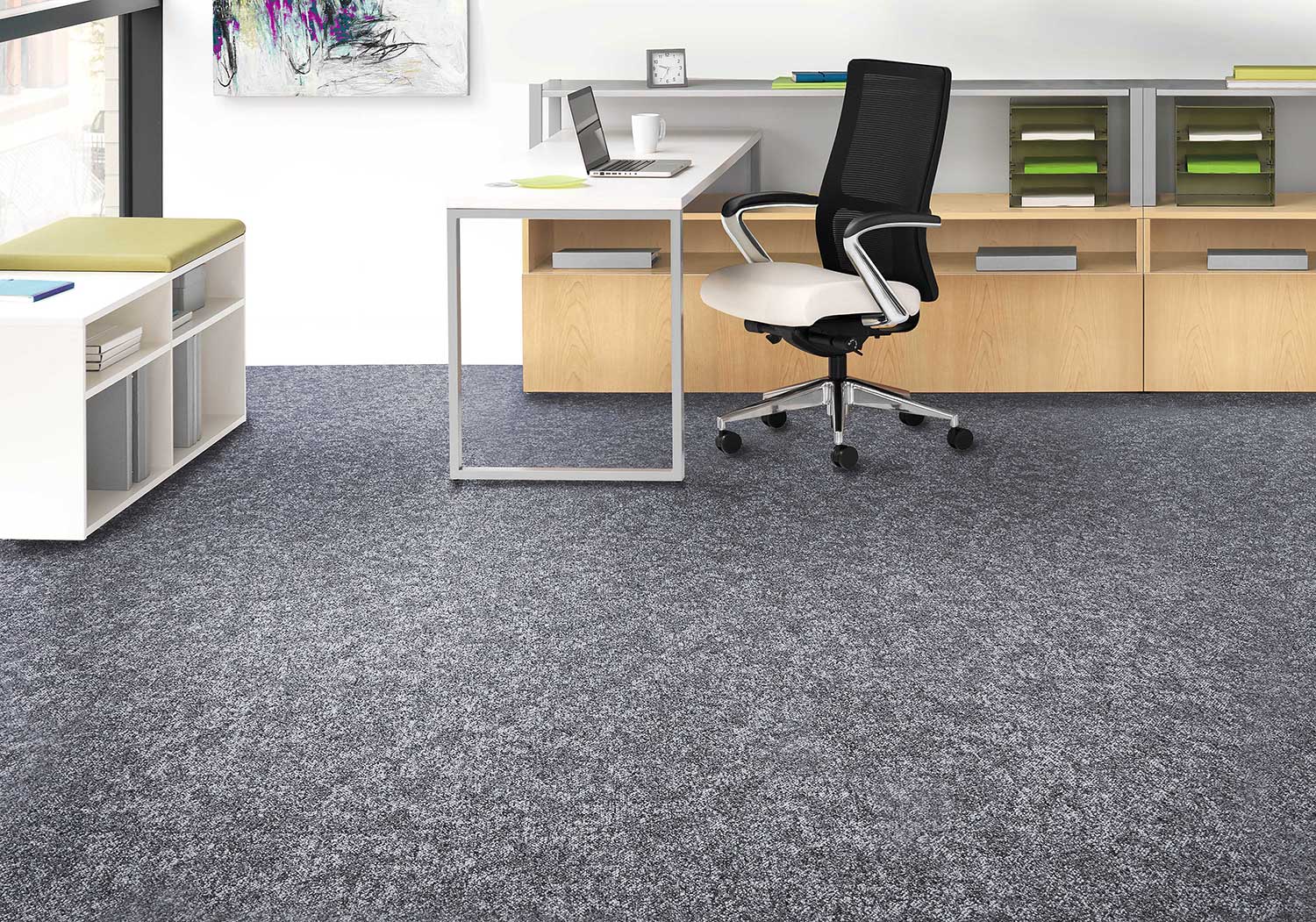 В офисе выгодно проявляются такие качества, как износостойкость ковролина, хорошая теплоизоляция и свойства пожаробезопасности.