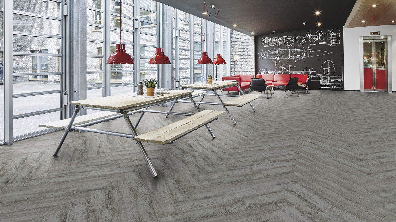 Португальский производитель Floorway представляет универсальное коммерческое ламинированное покрытие. Данный ламинат выполнен в виде отдельных планок небольшой длины, благодаря чему полностью имитирует штучный паркет. А необычный оттенок и натуральный древесный рисунок дополняют оформление и визуально приближают материал к натуральному дереву.