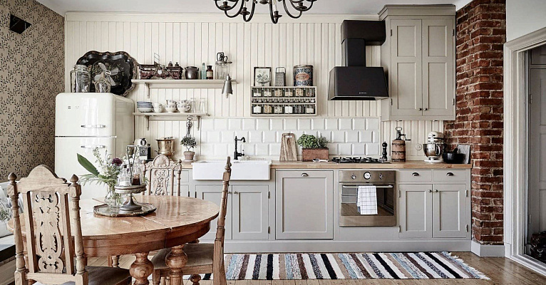 Винтаж – сочетание современного и старинного. В этом стиле прекрасно сочетается современное напольное покрытие и старинная мебель, новая бытовая техника и граммофон с виниловыми пластинками. Поэтому при выборе отделочных материалов, предметов быта и мебели, владельцы ограничены только общей концепцией стиля и своей фантазией.