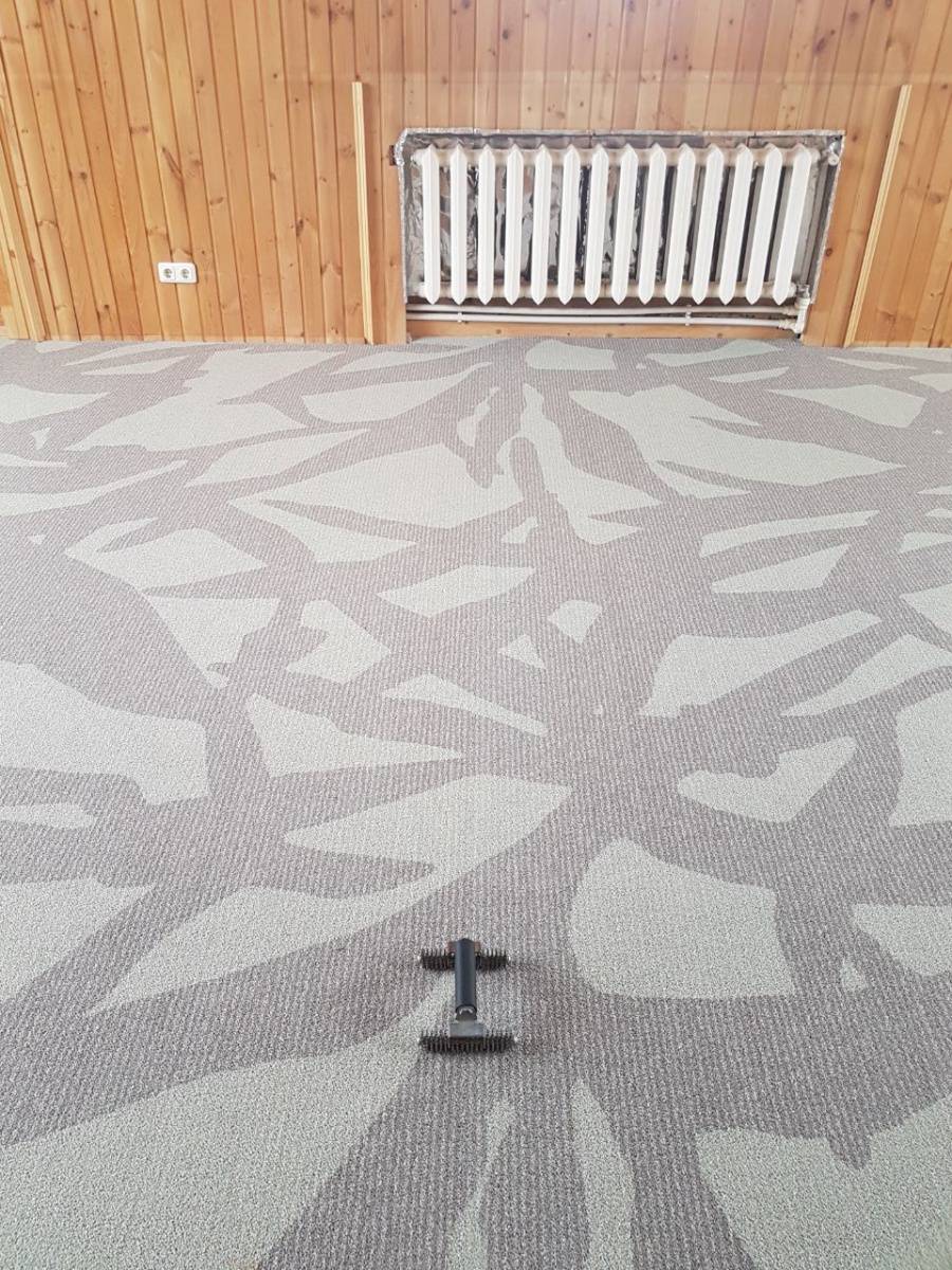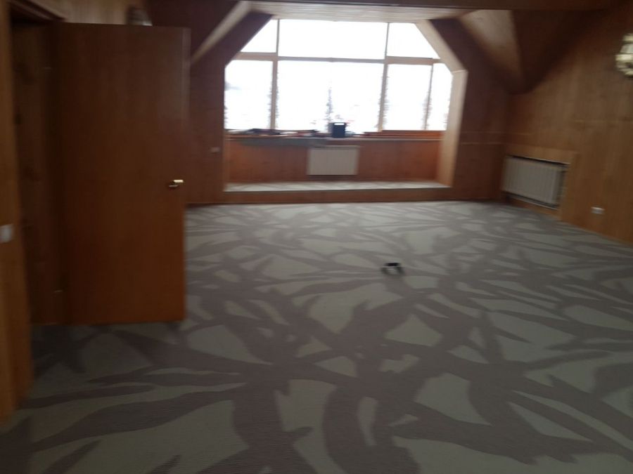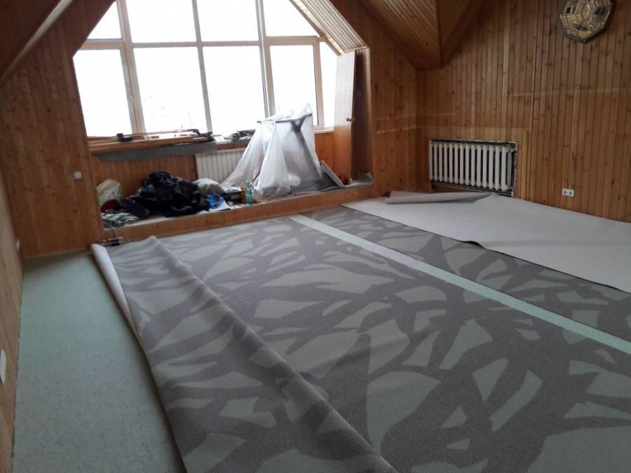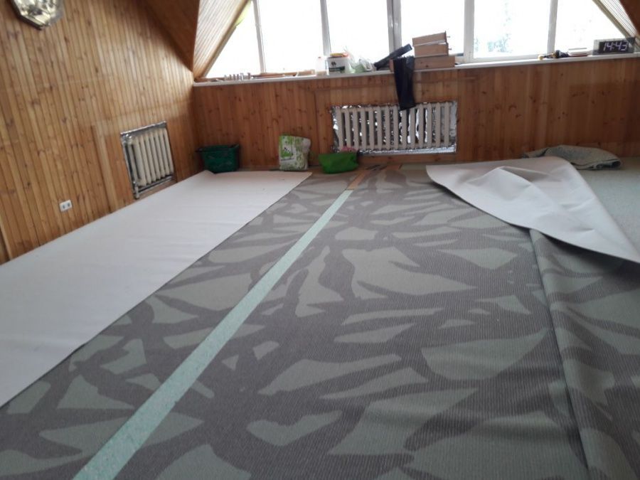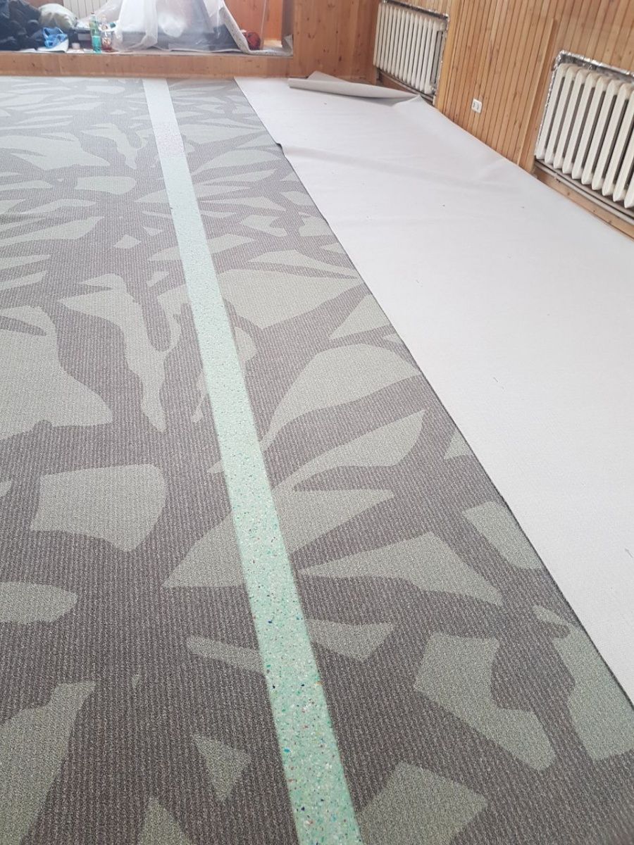После утверждения модели, состоялся выезд замерщика. При проведении расчетов и монтажа важно было учесть сложную форму помещения. Нашей команде удалось провести укладку покрытия, избежав стыков.