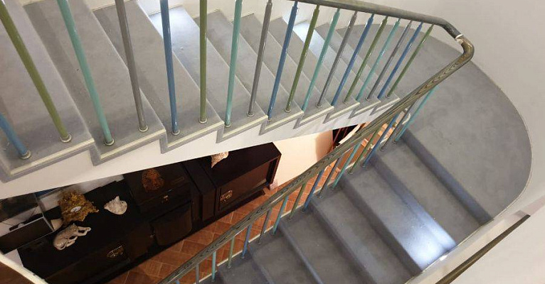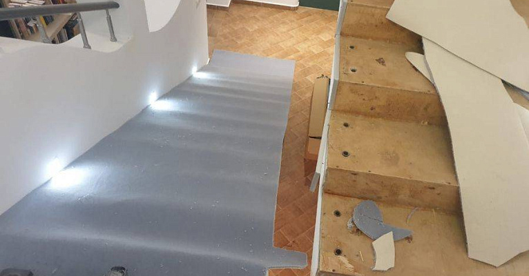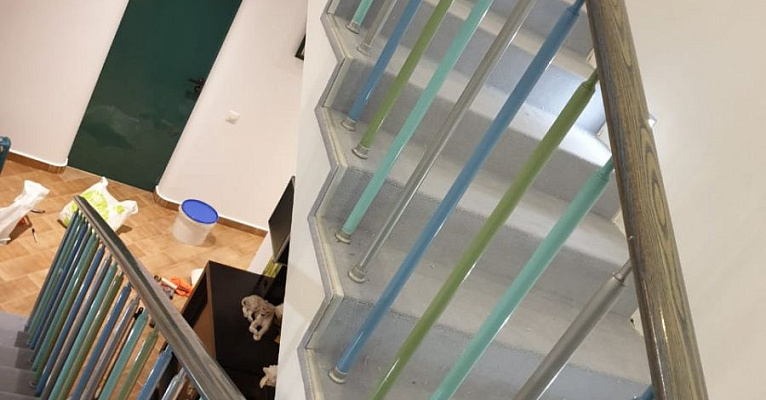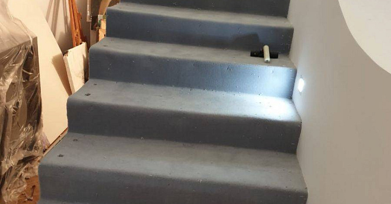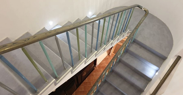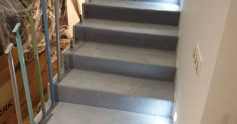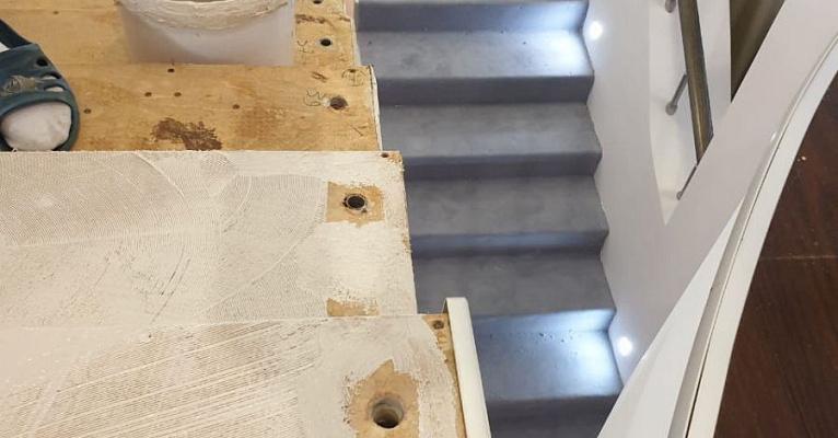 Этот проект наши специалисты выполняли для частного дома. Основная особенность задачи – завод коврового покрытия на полувинтовую закругленную лестницу. Чтобы осуществить монтаж и сделать итоговый результат эстетичным, был выбран шерстяной рулонный ковролин нейтрального серого оттенка. В процессе укладки покрытие подвергалось фигурной резке и стыковке в местах изгиба.