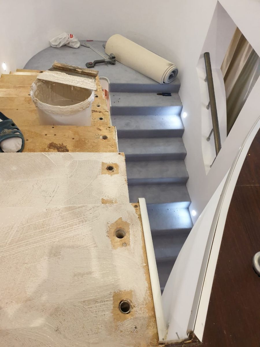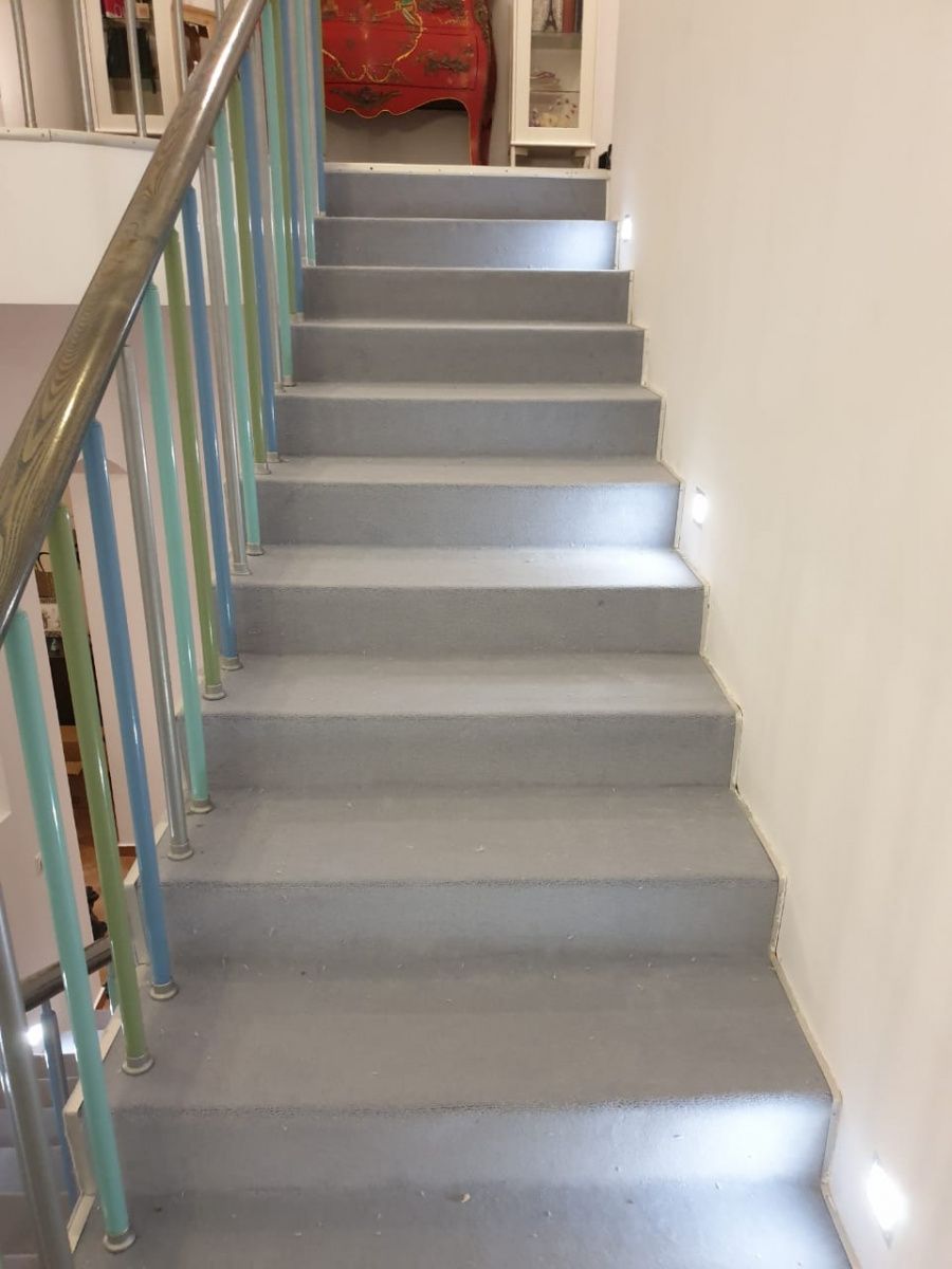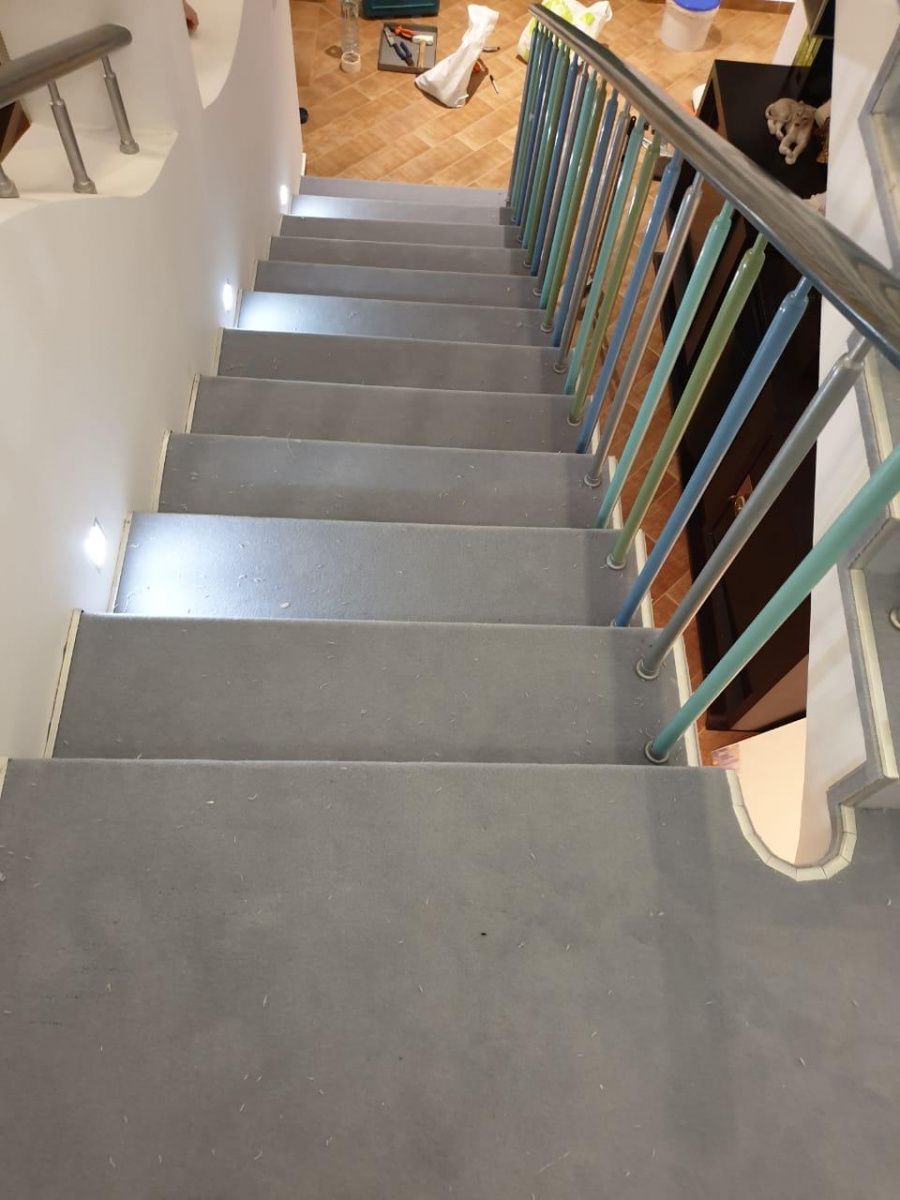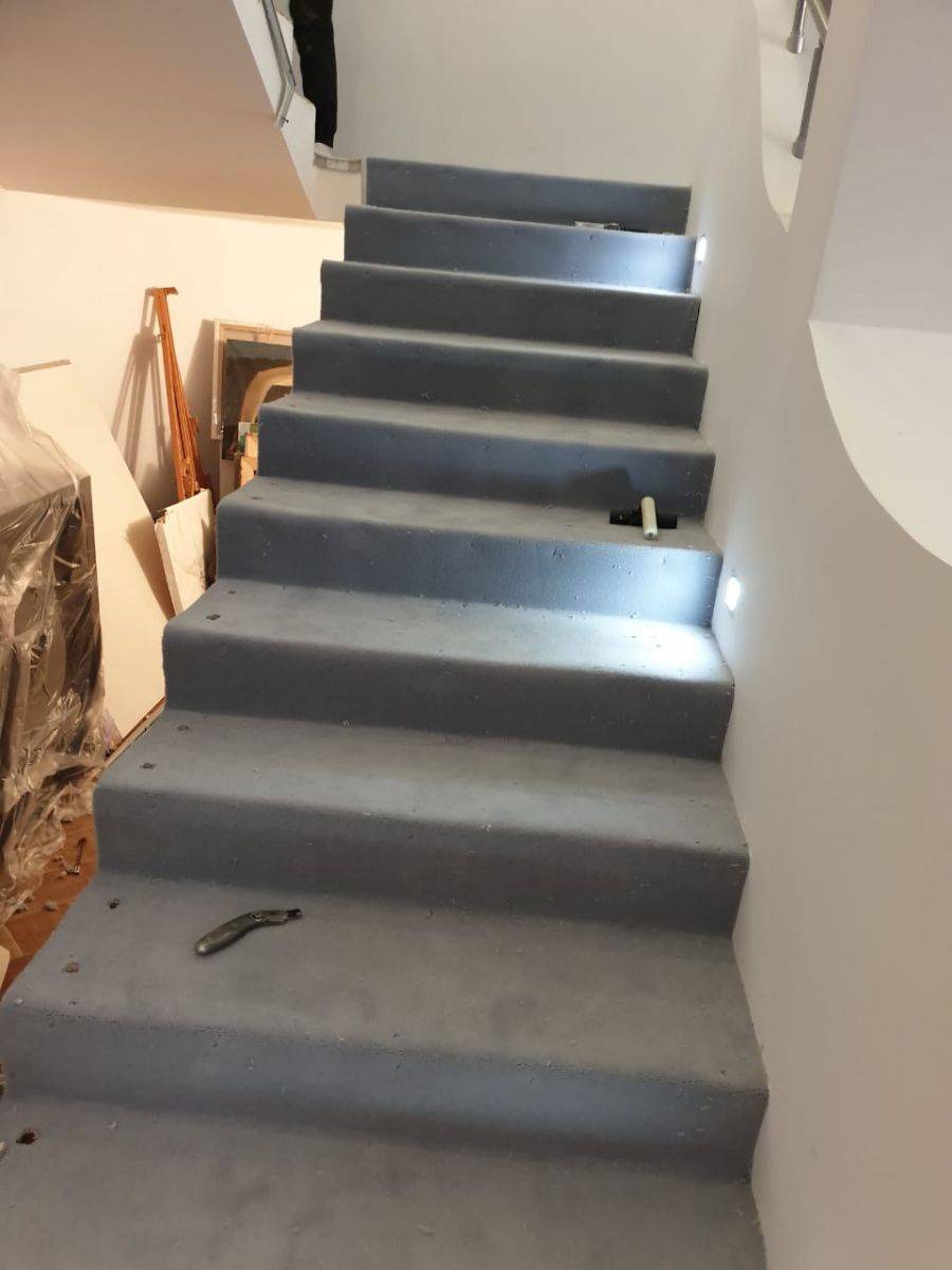 Этот проект наши специалисты выполняли для частного дома. Основная особенность задачи – завод коврового покрытия на полувинтовую закругленную лестницу. Чтобы осуществить монтаж и сделать итоговый результат эстетичным, был выбран шерстяной рулонный ковролин нейтрального серого оттенка. В процессе укладки покрытие подвергалось фигурной резке и стыковке в местах изгиба.