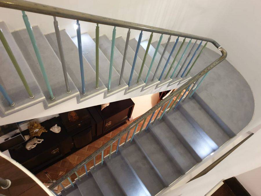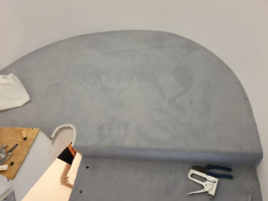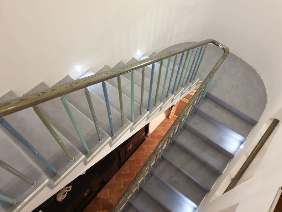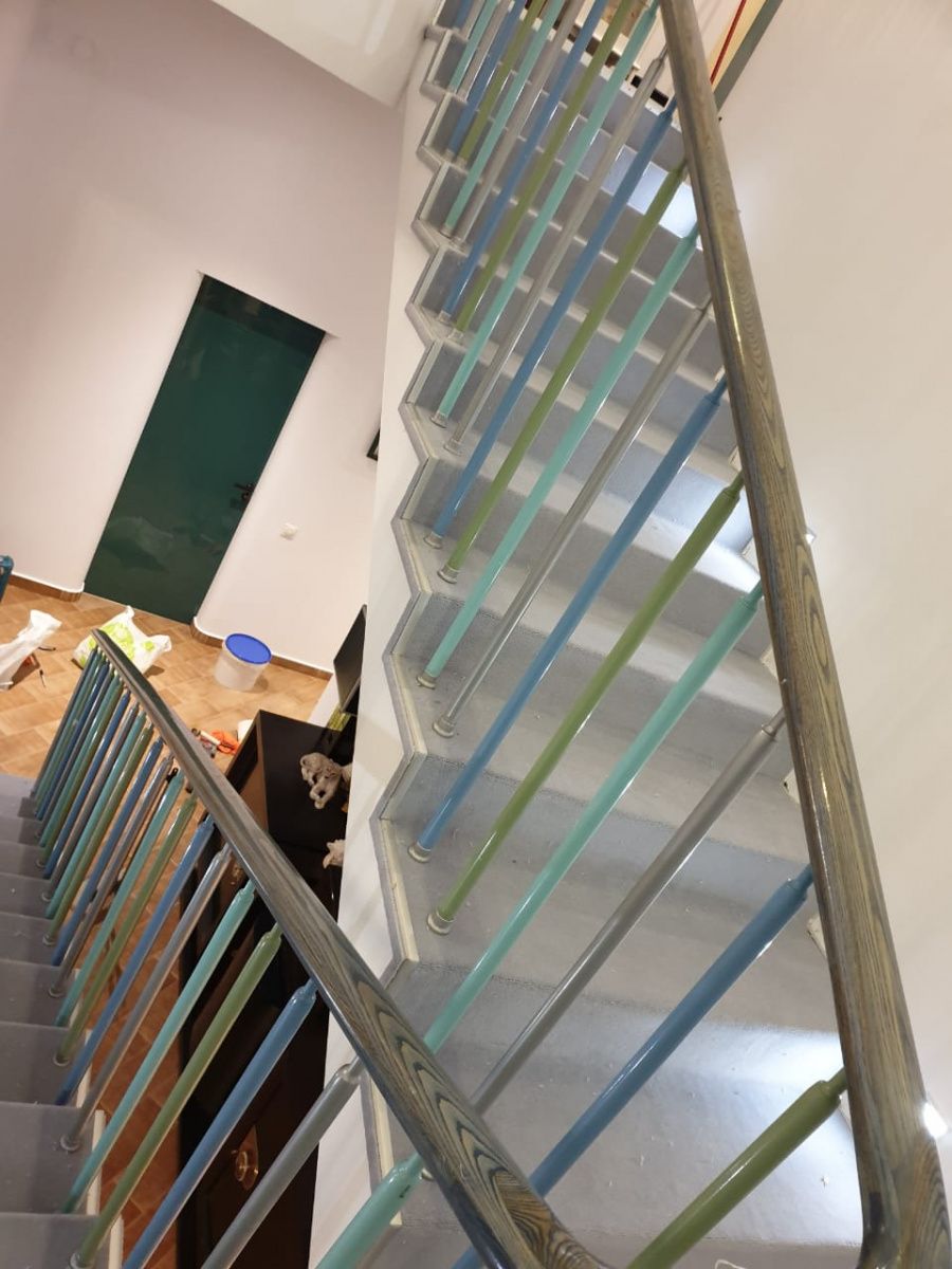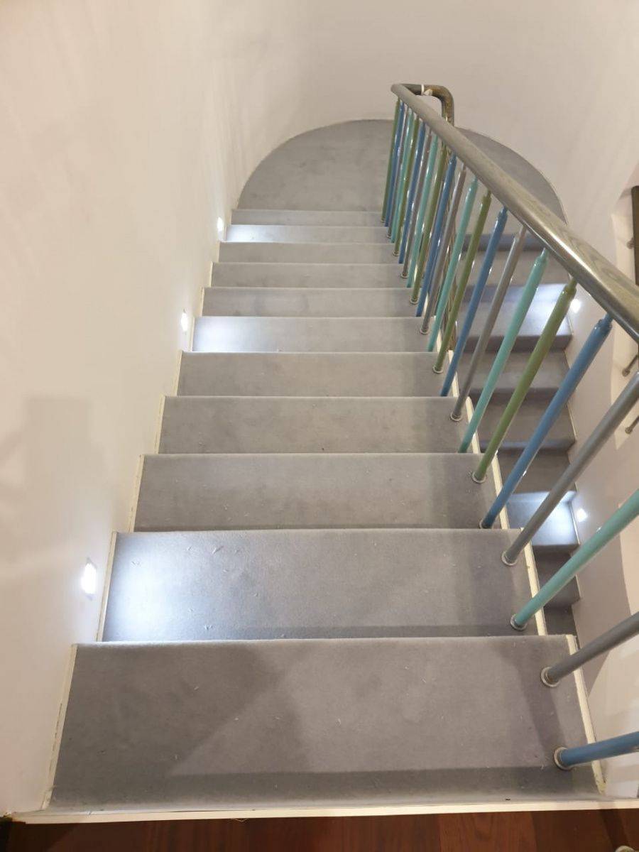 Этот проект наши специалисты выполняли для частного дома. Основная особенность задачи – завод коврового покрытия на полувинтовую закругленную лестницу. Чтобы осуществить монтаж и сделать итоговый результат эстетичным, был выбран шерстяной рулонный ковролин нейтрального серого оттенка. В процессе укладки покрытие подвергалось фигурной резке и стыковке в местах изгиба.